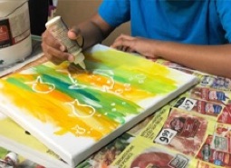 The medium is applied on primed board or canvas with background colours to resist or mask off certain areas.